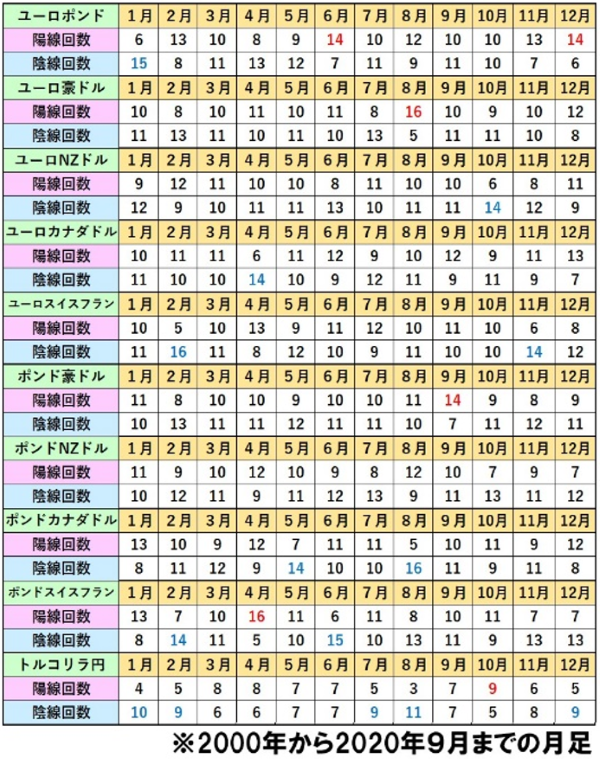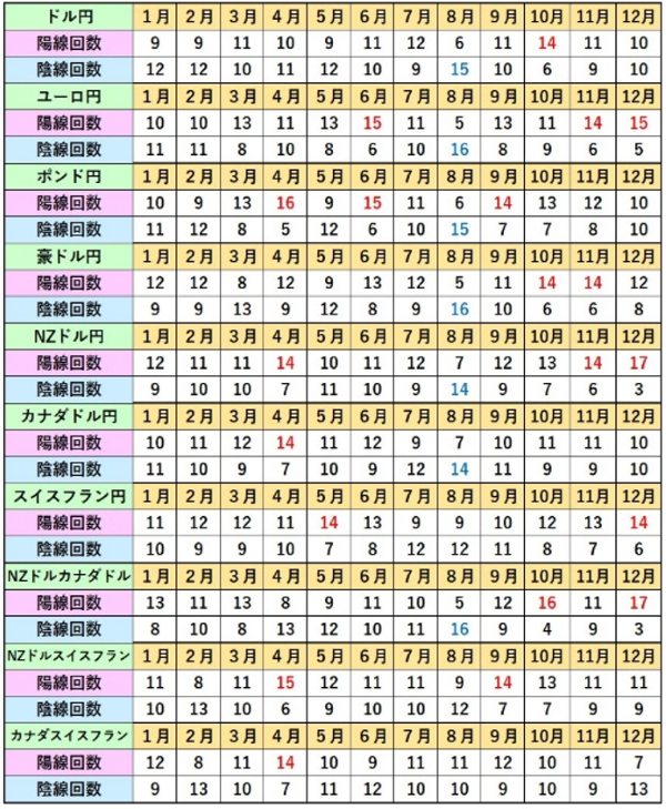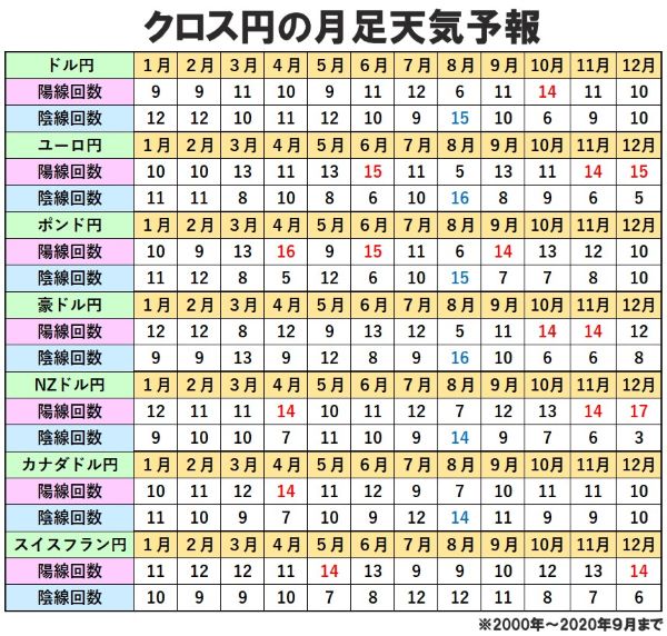 下のクロス円の月足データの8月の欄を見てみると、ドル円とポンド円の陰線回数が過去21年間中15回、ユーロ円と豪ドル円は16回、NZドル円とカナダドル円は14回と、ほとんどのクロス円で陰線になった回数が多くなっています。