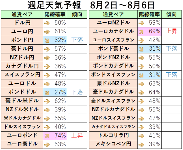 8月2日~6日の週足の統計データを見てみると、ポンド円の陽線確率が32%、ポンドドルは27%、ポンド豪ドルとポンドスイスフランは31%と低く、ポンドが決済通貨になっているユーロポンドは74%と高くなっています。