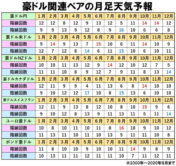 また、豪ドルに関する通貨ペアを見てみると、8月は豪ドル米ドルと豪ドルカナダドルの陰線回数が15回、豪ドルが決済通貨になっているユーロ豪ドルの陽線回数が16回と多くなっています。このことから8月は、豪ドルが売られやすい傾向・アノマリーがあることが分かります。