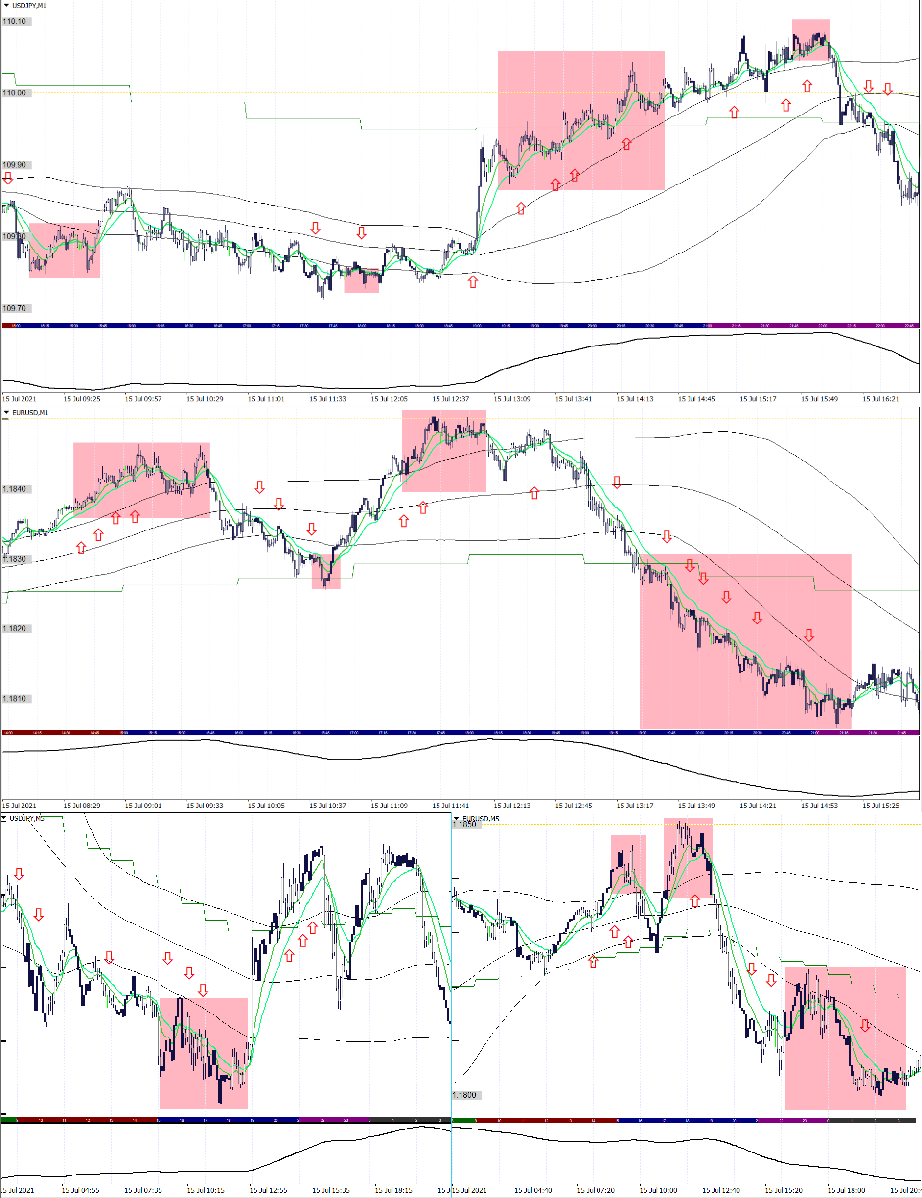 赤矢印:1日+3~10pipsのスキャルロジックによる、エントリーポイント