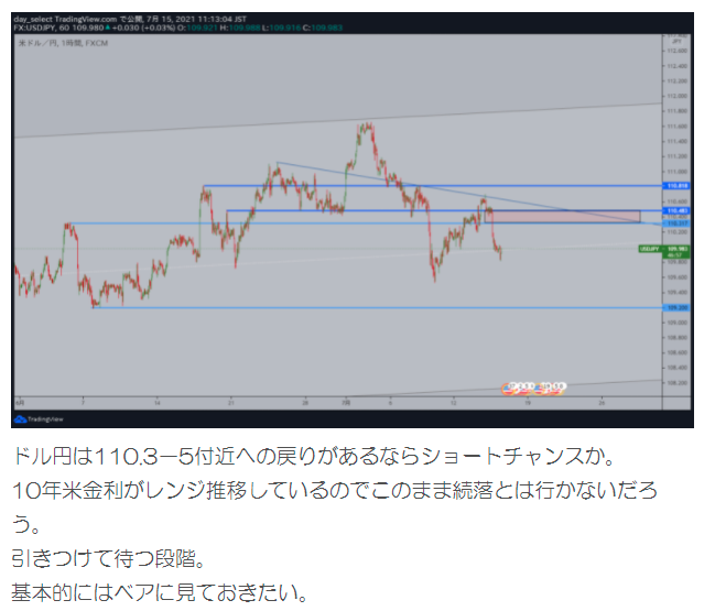 先週の記事で配信したドル円のショートは段階的な利確を挟みながら109.2で全利確。