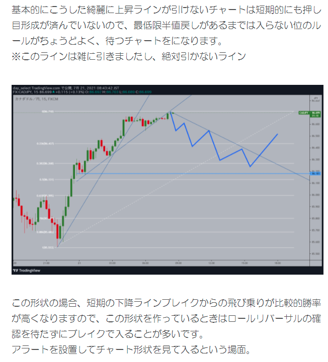 コンテンツは平日に配信予定。 ほぼほぼデイリーですが、特記することがない場面で無理に配信することはありません。 コンテンツには限定ツイキャスを使用したライブ配信(不定期)、stand.fmを使用したラジオ配信を含みます。 お盆、年末年始など生活上物理的に寄稿が難しい場合は休載になります。 内容 使用する手法はトレンドライン、水平ライン、フィボナッチを使用したライントレード主体。 ファンダメンタルズ分析を用いながら中長期需給を捉えライントレードで細かな部分を分析。 チャート画像多めになります。 想定読者層 フローや、経済政策、需給ギャップなどを勉強したい方を中心にプラスワンでポジションに根拠が欲しい方を想定しています。 逆に、ミラートレードに近いレートをとにかく知りたい方向けには向いていない記事になると思います。 寄稿者としては情報を入れるだけにせず自己判断出来る投資教育に近い記事になるように書いています。