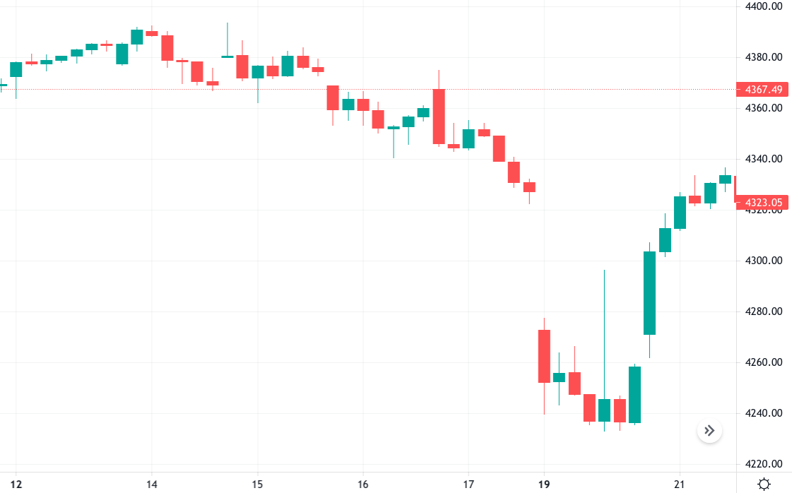 そこからさらに50pips下げたのでヒヤヒヤしましたが、4240付近でやっと反発