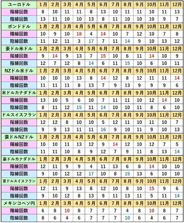 下の表は各通貨ペアの月足を2000年から数えたものになります。