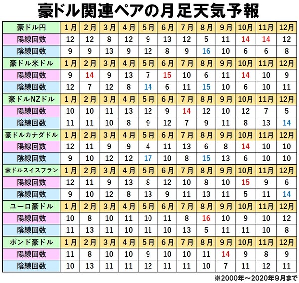 また、豪ドルに関する通貨ペアを見てみると、8月は豪ドル米ドルと豪ドルカナダドルの陰線回数が15回、豪ドルが決済通貨になっているユーロ豪ドルの陽線回数が16回と多くなっています。このことから8月は、豪ドルが売られやすい傾向アノマリーがあることが分かります。