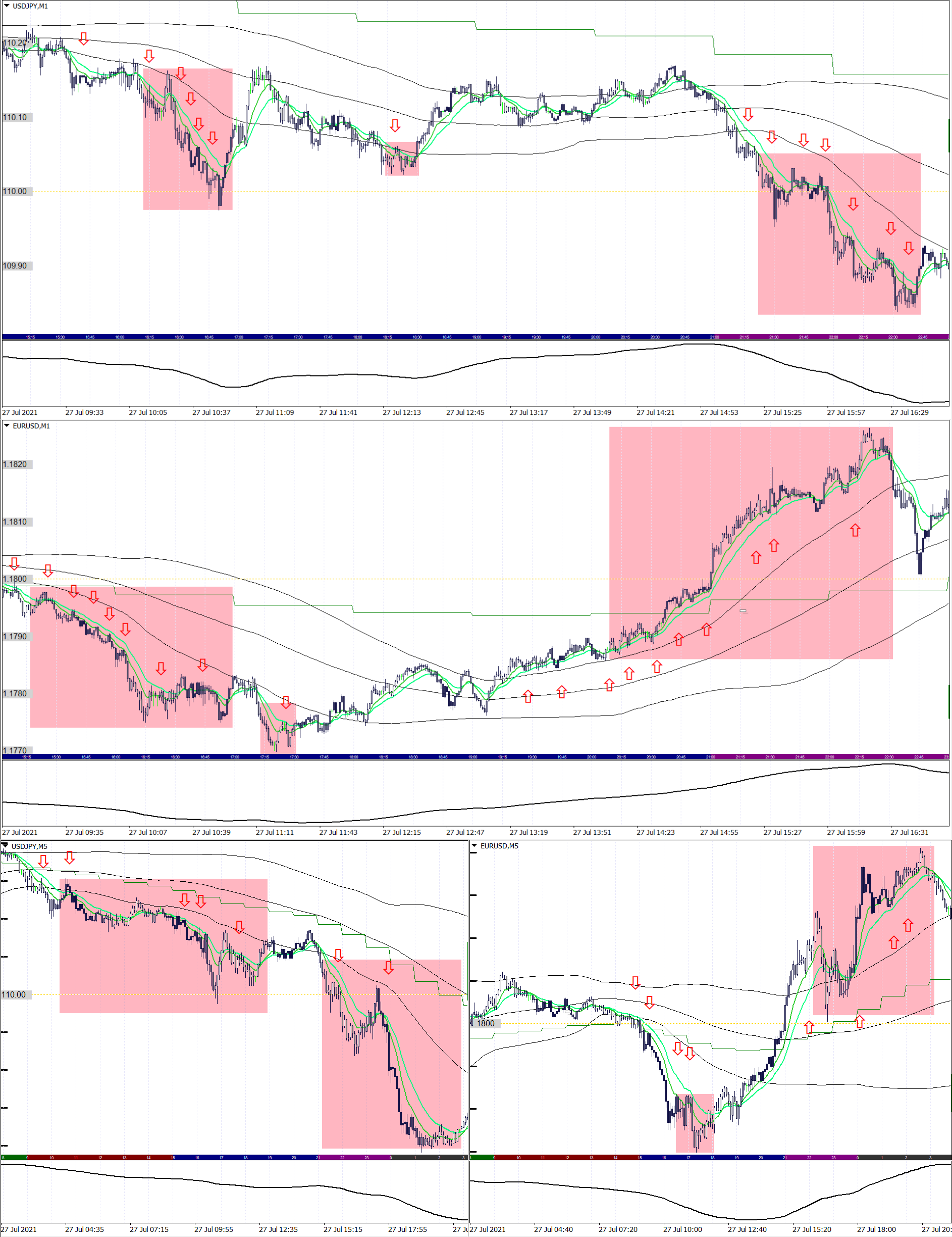 赤矢印:1日+3~10pipsのスキャルロジックによる、エントリーポイント