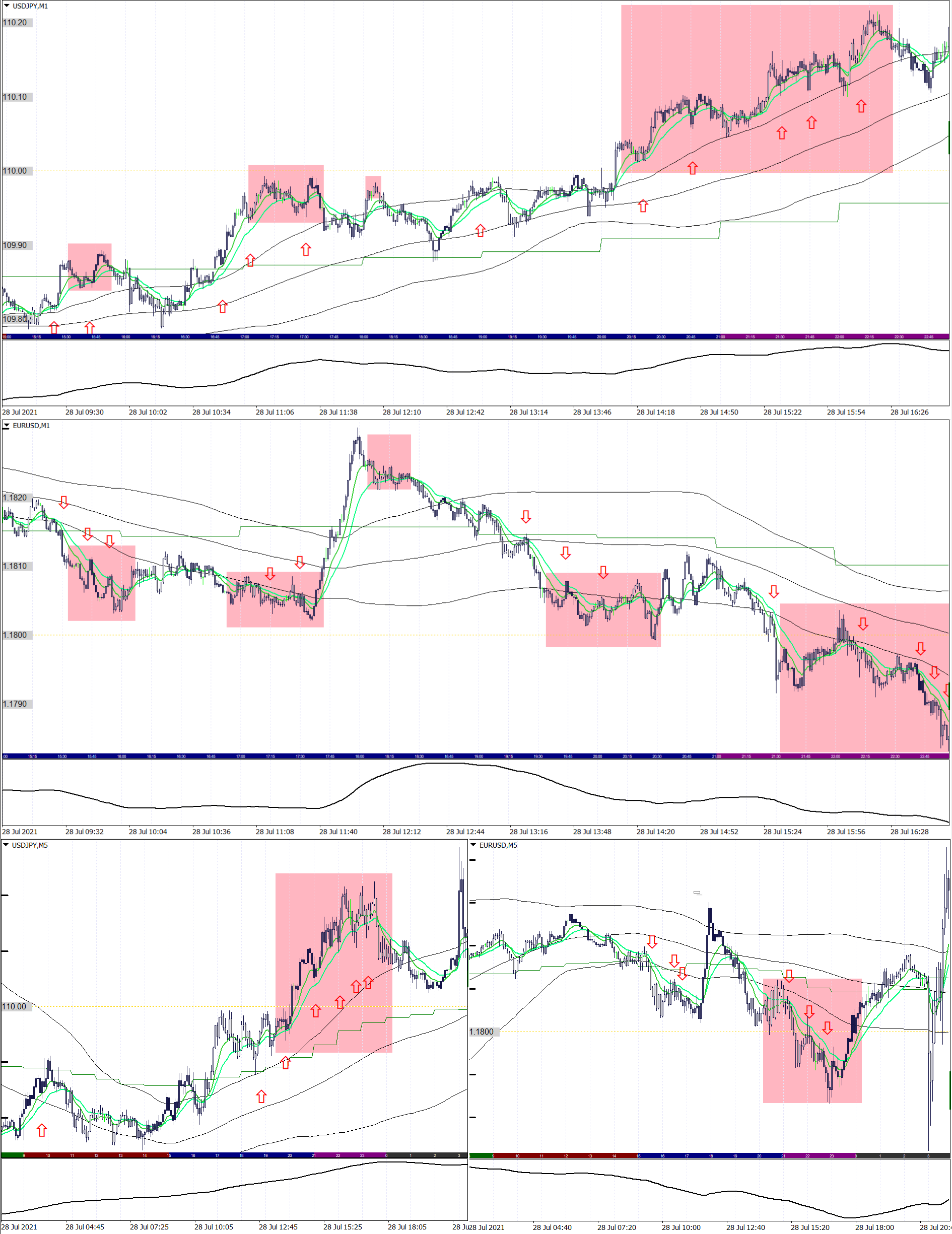 7/28 【1日+10pips楽度★★★★★★★】FOMCは無視!普通にトレードすればいい 手法のロジックに合致する、エントリーゾーン、ポイント ドル円(USDJPY)、ユーロドル(EURUSD) 1分足、5分足 欧州時間~NY時間で動いているので楽に+10pips以上 深夜3時にFOMC、それまでに終われば良い サイコロナンバーは気をつける ドル円 110.00を越えられずの時間が続く ロジック合致箇所が、110.00付近であれば、いわずもがな要注意 ユーロドル 1.1800に近づきつつ、なかなか下抜けず ロジック合致箇所が、1.1800付近であれば、いわずもがな要注意 重要経済指標、FOMC FX世間ではちょっとしたイベントですが、無視 その後の、パウエルFRB議長の記者会見、これも無視 トレードはその前にやめてしまうのが得策かと思います まぁ深夜3時の話なので、どのみちトレードしてない人も多いでしょうが 米雇用統計の時もそうですが、その前の流れ 変に、専門家的な人に分析なんぞ聞かなくて良い ボラティリティが無いのか、出始めたのか、有るのか、 いつも通り、ロジック通り、インジケーターで判断すればいい ただ、真っ只中、真っ最中はロジックが効かない動きになること多々 なので、トレードしない 重要経済指標の前後は、ロジックの根拠がなくなる、ということでノートレード 優位性のあるロジックって、実は沢山あります 自分が、トレードでできること、やりたいこと、取りたい利益、利益率等、 トータルで利益にするためのプランに、合う合わないがかなり重要なファクター 赤四角:1日+10pipsのロジックによる、エントリー可能ゾーン 赤矢印:1日+3~10pipsのスキャルロジックによる、エントリーポイント 関連リンク一覧 https://lit.link/fuc https://www.gogojungle.co.jp/tools/ebooks/23968 https://www.gogojungle.co.jp/tools/ebooks/27712