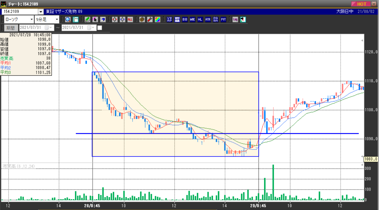 しかしその日の引けまではあと4時間、この場合このラインが底値と考えることはあまり良くありません。