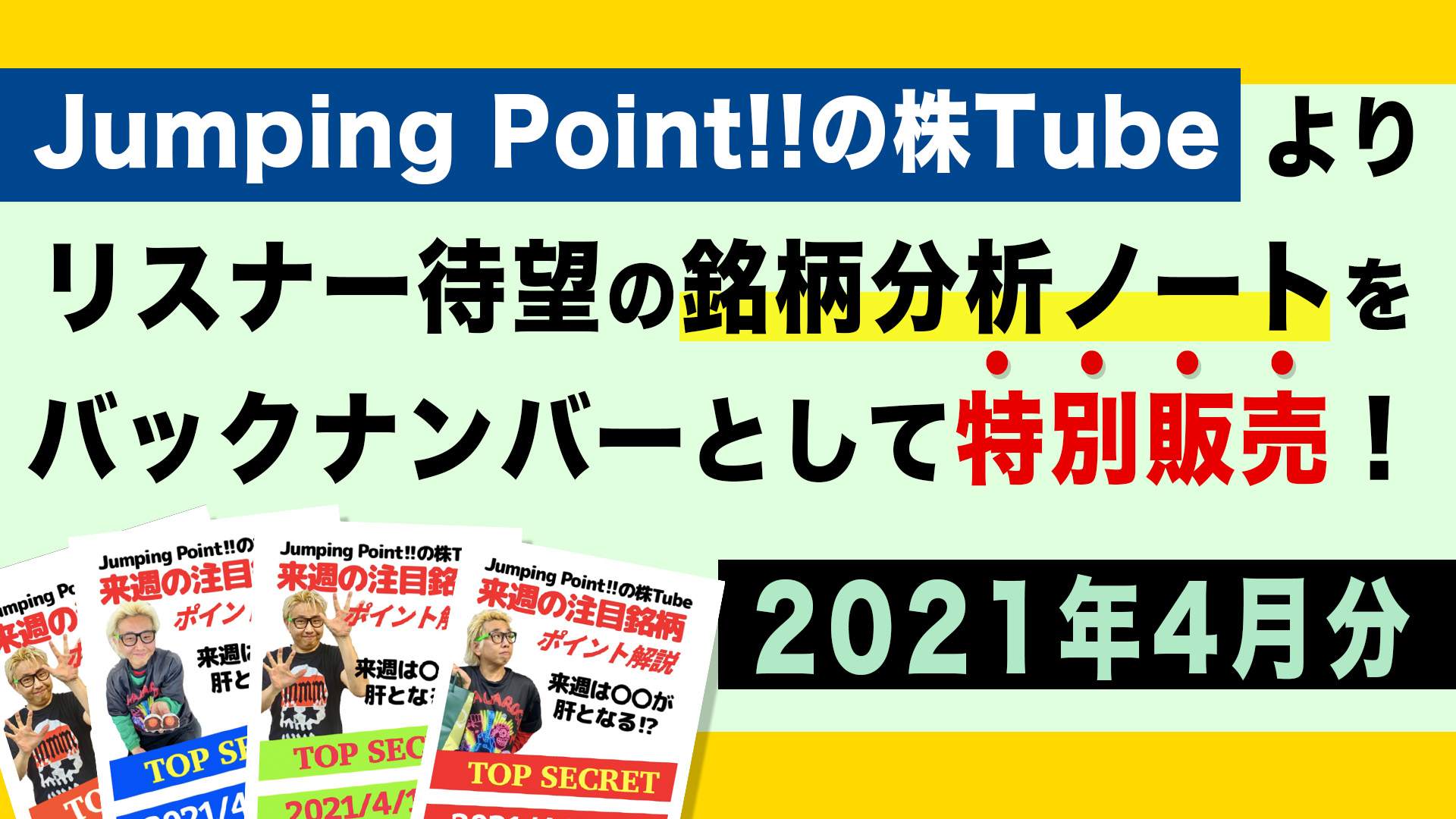 当ページは、『JumpingPoint!!の株Tube』から販売されている「来週の注目銘柄ポイント解説先出しノート」 &「 振り返りノート」のバックナンバー購入(2021年4月分)ページとなります。