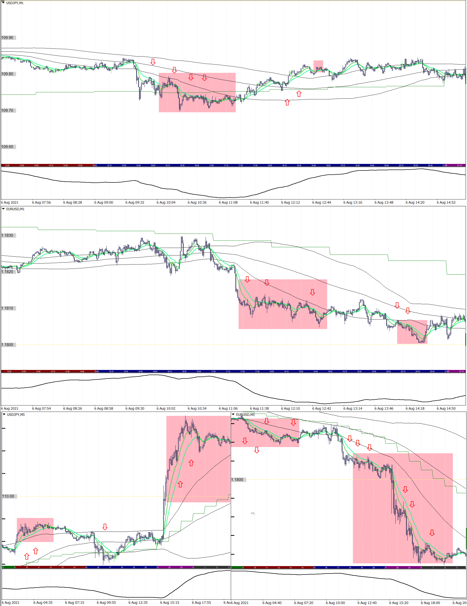5分足チャートでは、米雇用統計中にも矢印などを表示してはいますが、