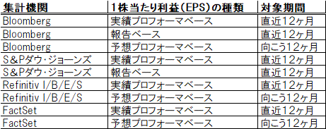 その昔は、S&P社が集計する報告ベースのデータしかなかったが、その後、IBES社が証券会社のアナリストのデータの集計を始め、IBES社の予想プロフォーマベースのデータが一般的になった。今でもそれが主流であるが、Bloomberg社の予想プロフォーマベースのデータやFactSet社の予想プロフォーマベースのデータもよく使われいるようだ。