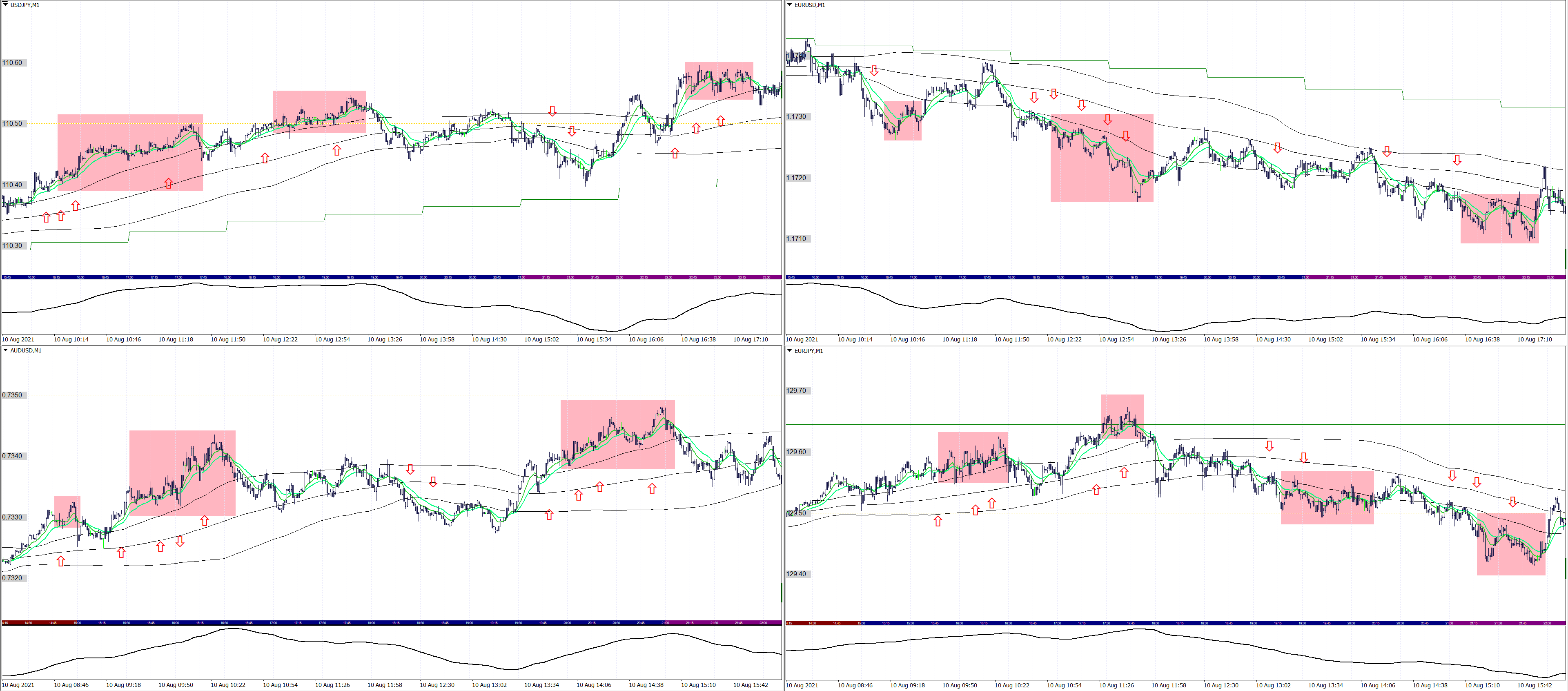 赤矢印:1日+3~10pipsのスキャルロジックによる、エントリーポイント