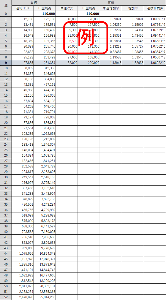 目標である「週複利換算1.11」の部分は、運用次第で不可能ではないと思います。