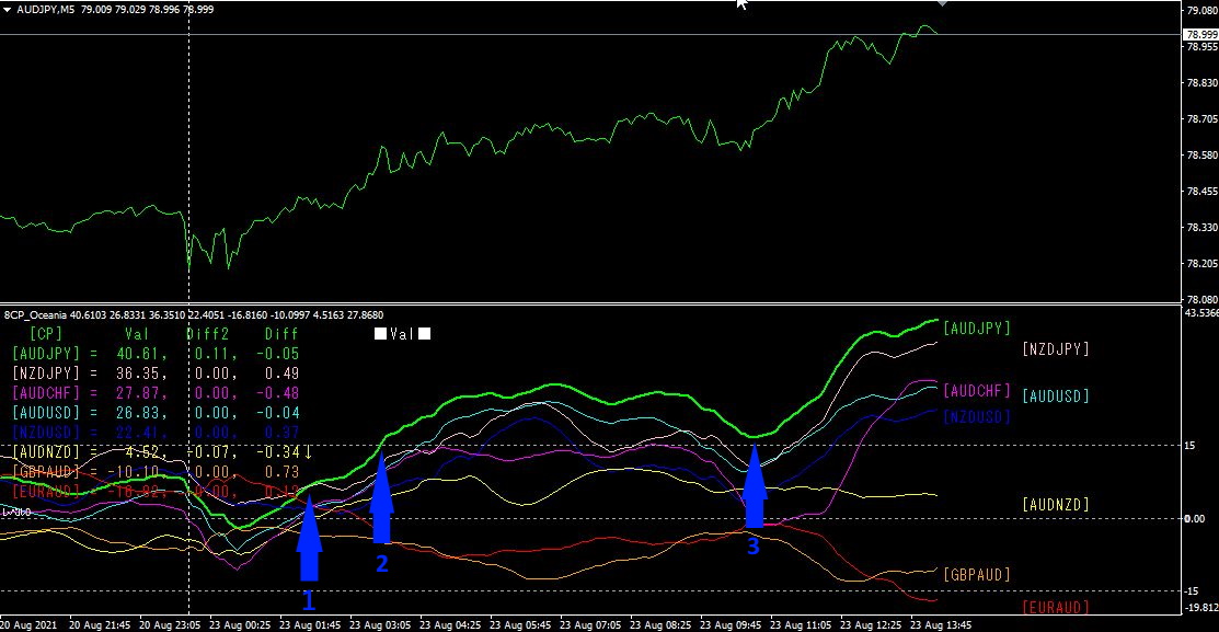 上半分にAUDJPYの5分足チャート、下半分に「8CP見える化インジケータ」を表示させてみました。