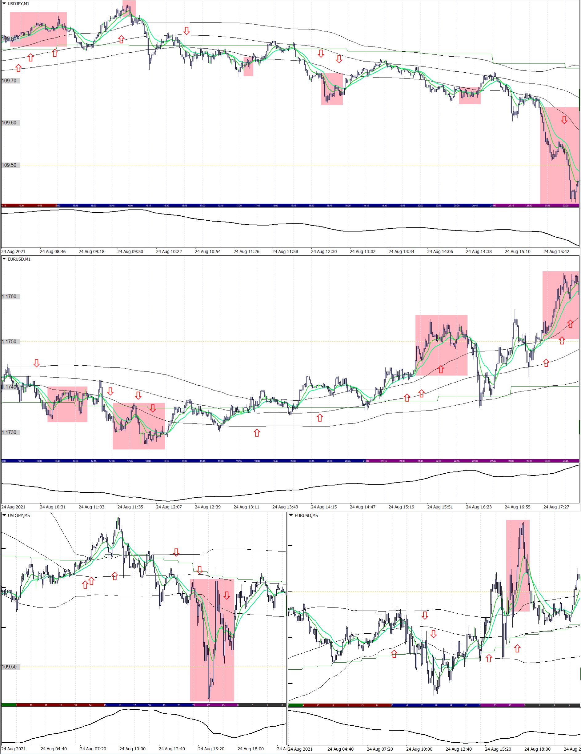 赤矢印:1日+3~10pipsのスキャルロジックによる、エントリーポイント