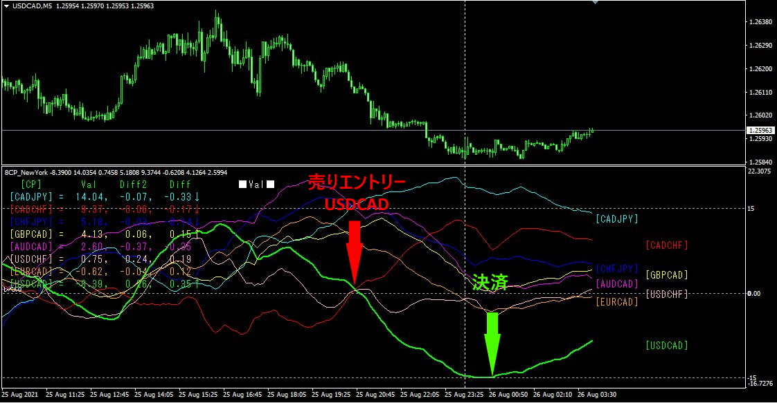 「8CP見える化インジケータ」のグラフ(USDCAD:緑色太線)が、チャート群を抜けて下落してきたので売りエントリーです。決済はグラフが横になり上向いてきたポイントにしました。上半分がUSDCADの5分ローソク足のチャートですが、綺麗に下落部分を捉えていることが良くわかります。