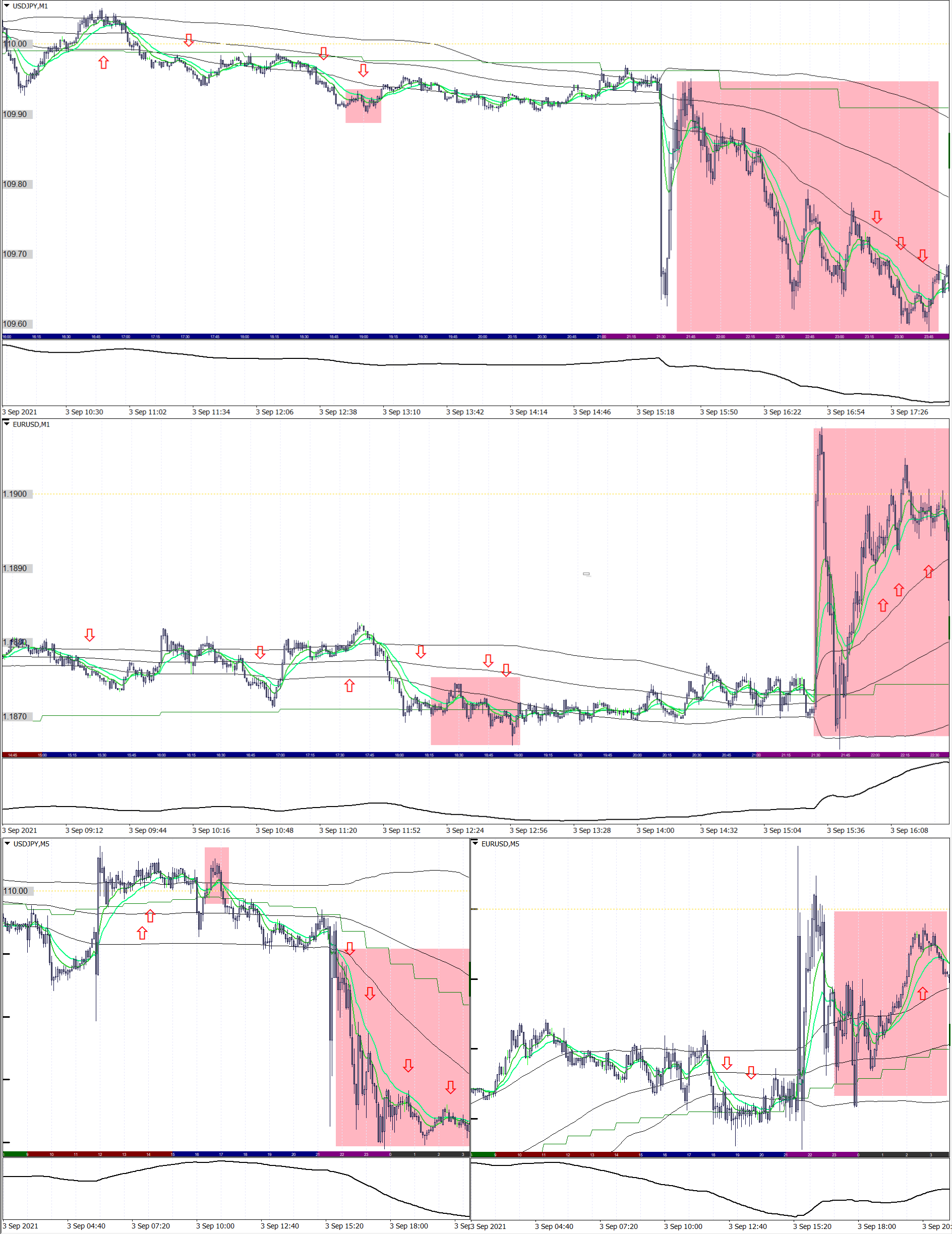 赤矢印:1日+3~10pipsのスキャルロジックによる、エントリーポイント