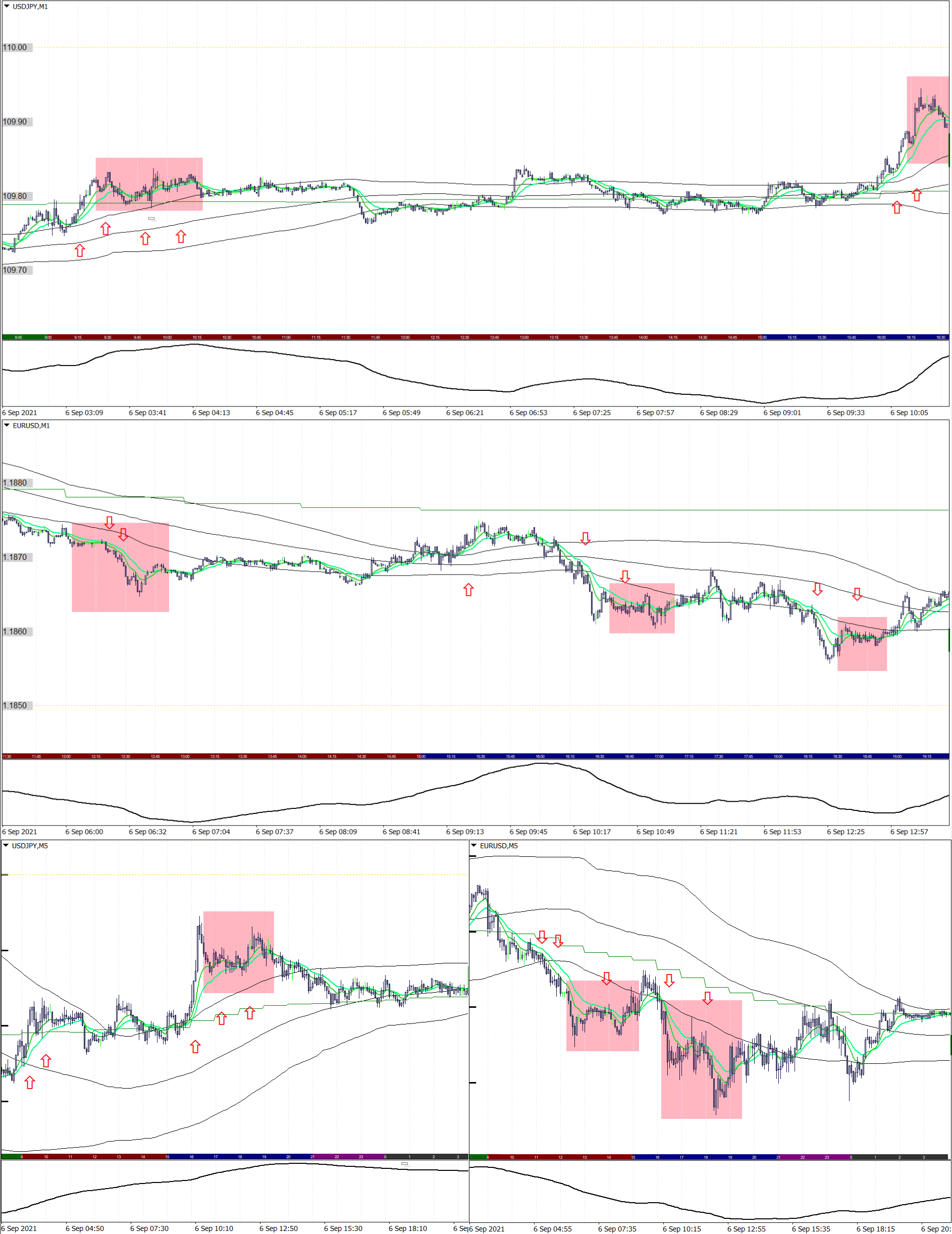 赤矢印:1日+3~10pipsのスキャルロジックによる、エントリーポイント