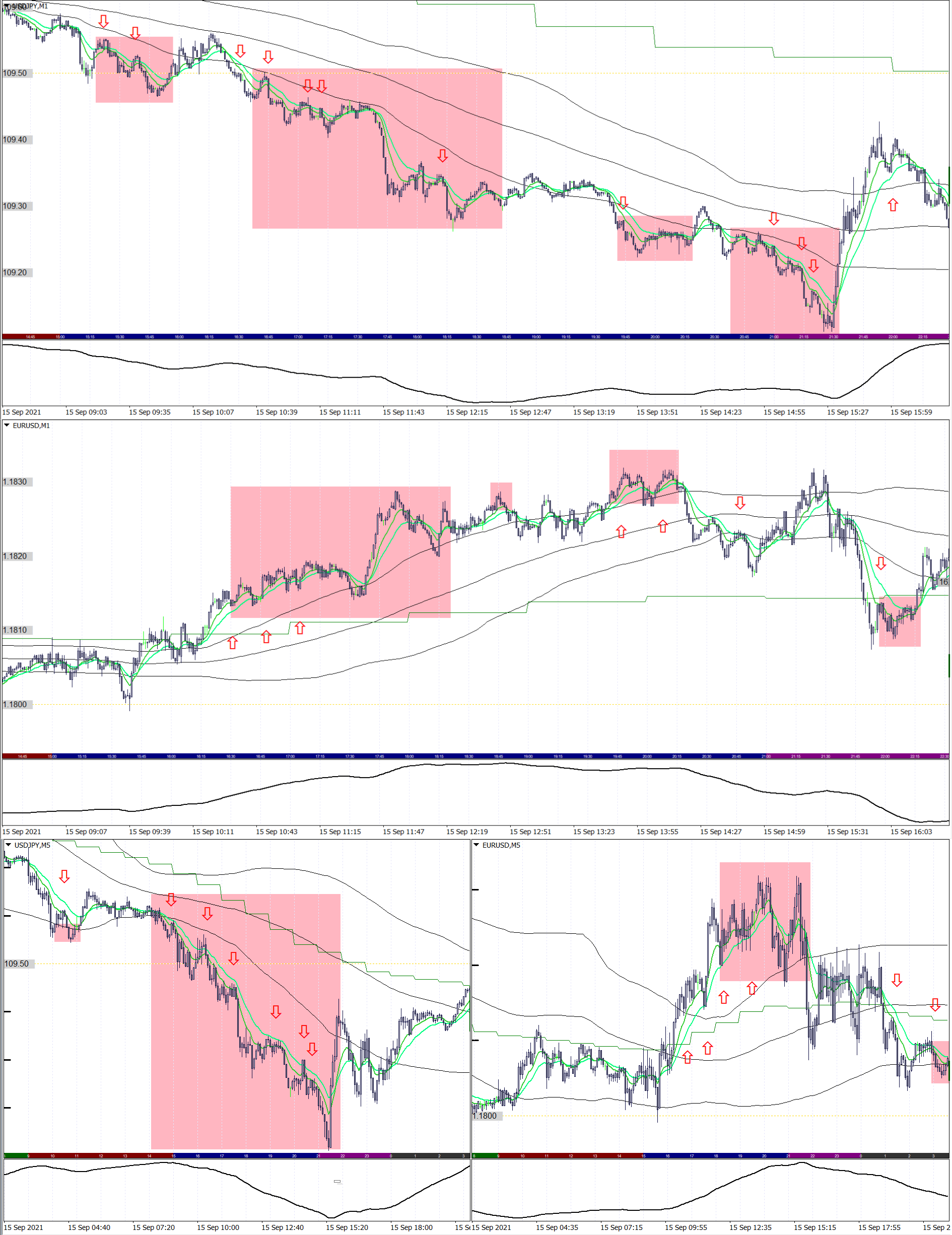 赤矢印:1日+3~10pipsのスキャルロジックによる、エントリーポイント