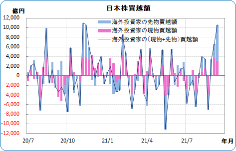 日本株投資部門別売買状況を見ると、8月23日(月)以降海外投資家の買いが大きい。