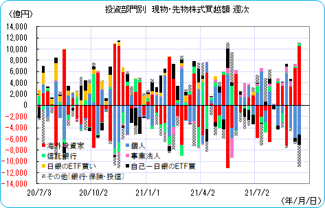 (注)「証券自己≒日銀ETF買い+その他」なので、証券自己は(日銀のETF買い)と(自己-日銀のETF買い)に分けた。