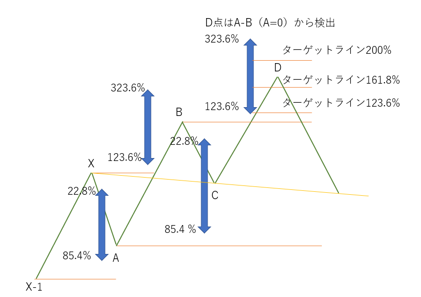 ハーモニックパターン検出インジケータV10では、X-1、X、A、B、C、Dという6点から波形を検出可能です。