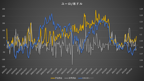 実現損益および評価損益が大きくプラスに振れている箇所を見てみると、2020年9月15日ごろの相場下落時や、2021年の5月12日ごろの相場上昇時など、その時々でプラスになる傾向は違うことが分かります。