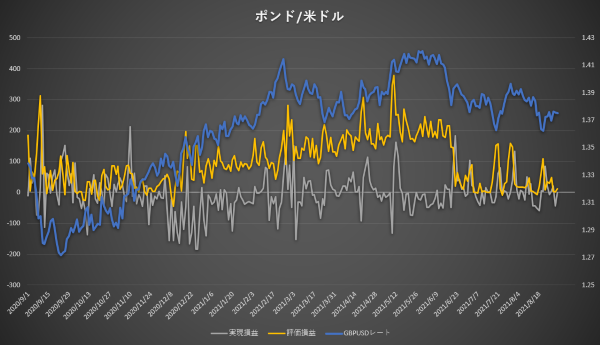 例えば2020年12月8日ごろと2021年7月21日ごろは同じような値動きをしていますが、12月8日ごろは大きくマイナスを出している一方で、後者は実現損益で大きくプラスを出しています。ここからも、ポンド/米ドルAIが徐々に相場を学んでいる様子が見て取れます。