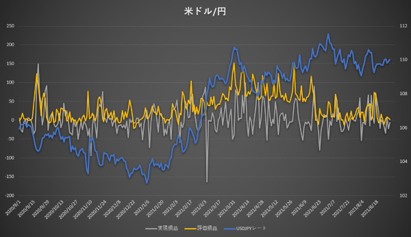 データは2020年9月1日から2021年8月31日における各通貨ペアの全AIエージェントの実現損益と評価損益それぞれの平均値と、その通貨ペアの終値を日足で並べたものになります。