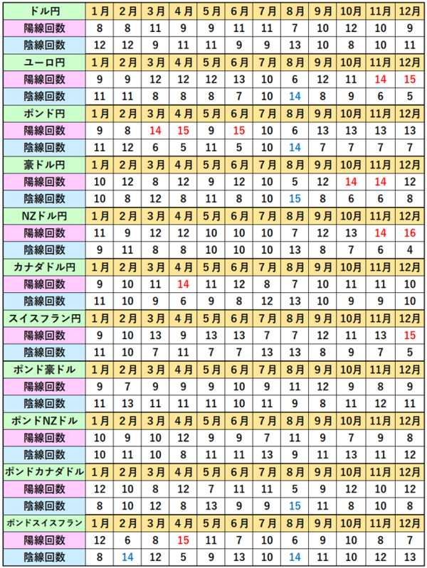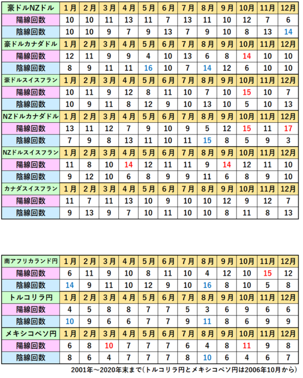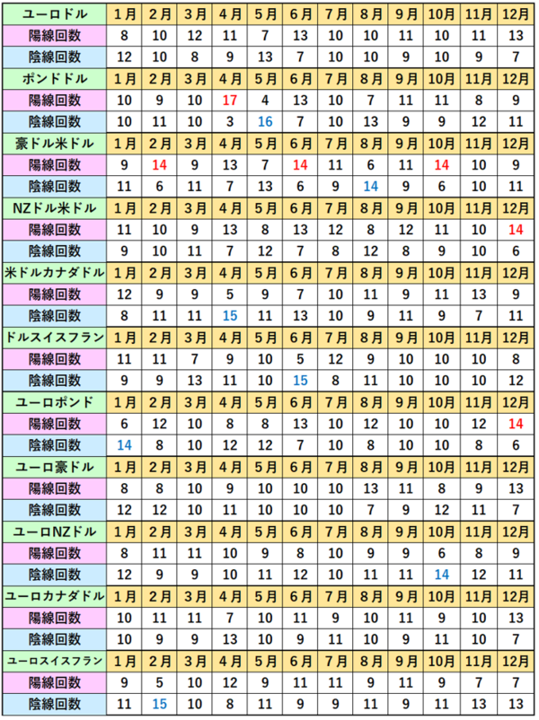 下の表は、全31通貨ペアの月足を2001年から数えたものになります。