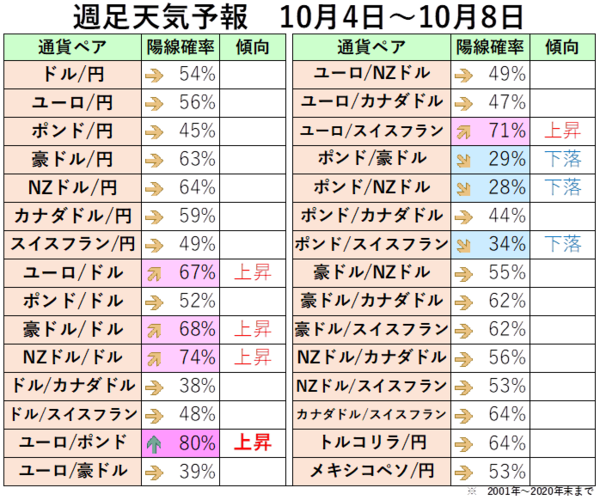 下の表は、過去20年間の10月4日~8日の週足を数えて陽線確率を算出したデータになります。