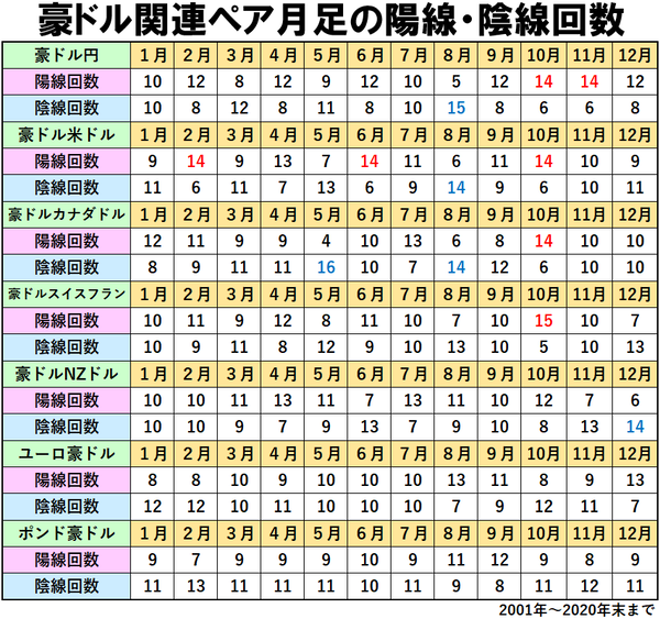 豪ドルに関する通貨ペアの月足の回数を見てみると、10月は豪ドル円と豪ドル米ドルと豪ドルカナダドルの陽線回数が過去20年間中14回、豪ドルスイスフランは15回と、陽線になった回数が多くなっています。
