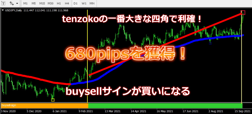 buysell-signに買いサインが出ました。上昇トレンドに乗り、680pipsを獲得しました!一番大きな四角のtenzokoサインで決済しました。