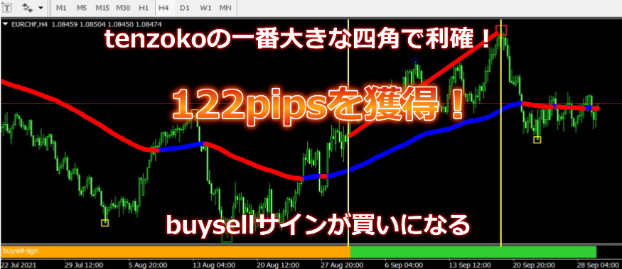 buysell-signが買いに転換しました。上昇トレンドに乗り、122pipsを獲得しました!一番大きな四角のtenzokoサインで決済しました。