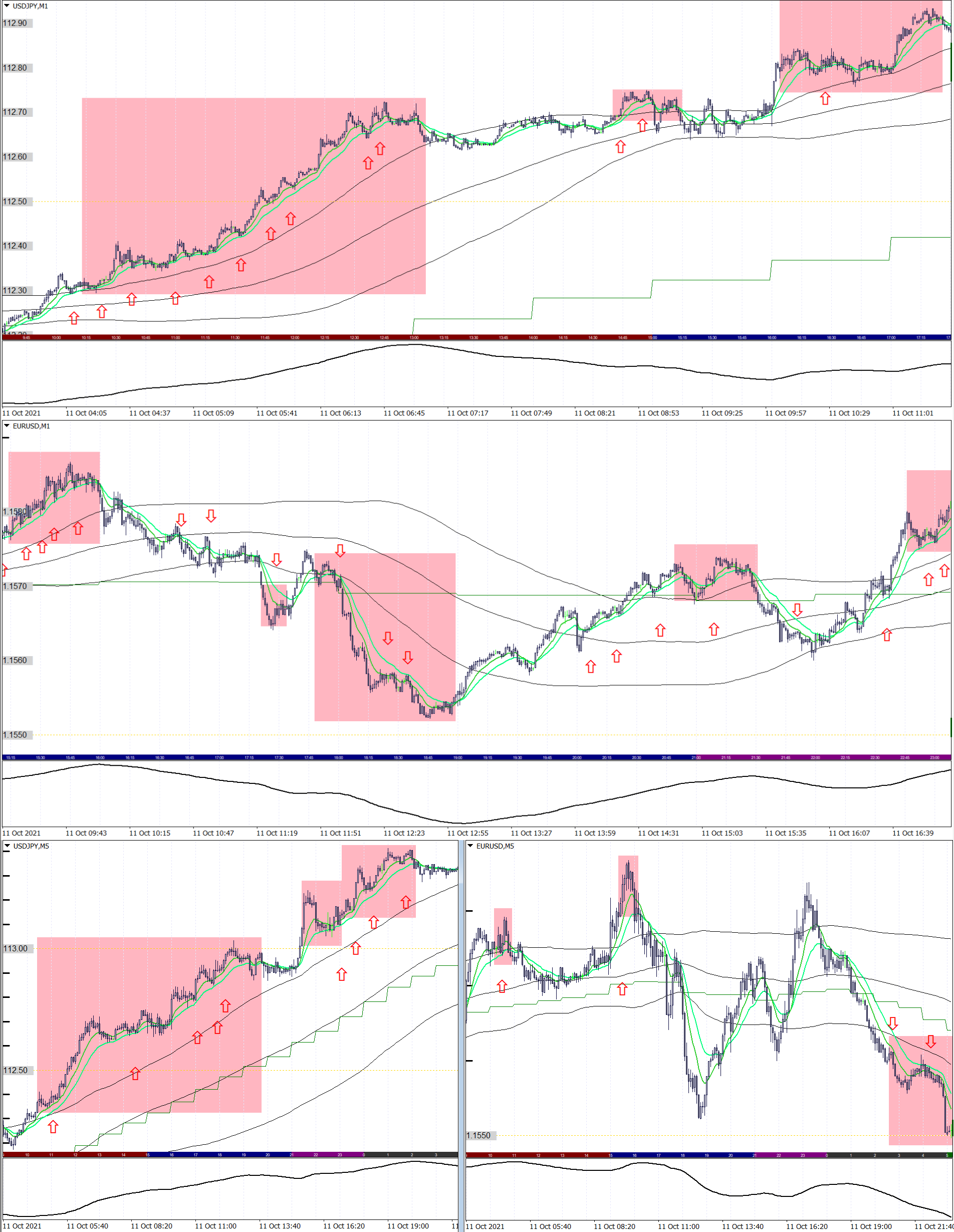 赤矢印:1日+3~10pipsのスキャルロジックによる、エントリーポイント