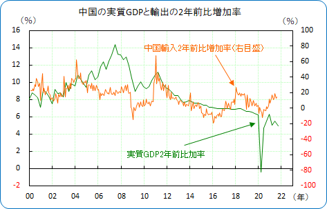 中国の2021年7~9月の実質GDPは前年同期比4.9%増だった。前期比は0.2%増(年率0.8%増)だった。前期(4~6月)と比べると殆ど横ばいに近い。