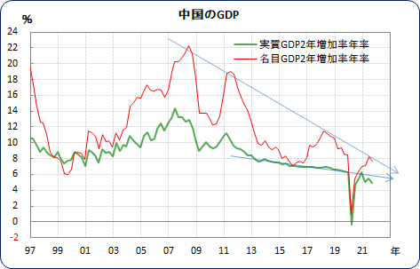 次のグラフは、中国のGDPの2年前に比べてどれだけ成長しているかを見たものである。