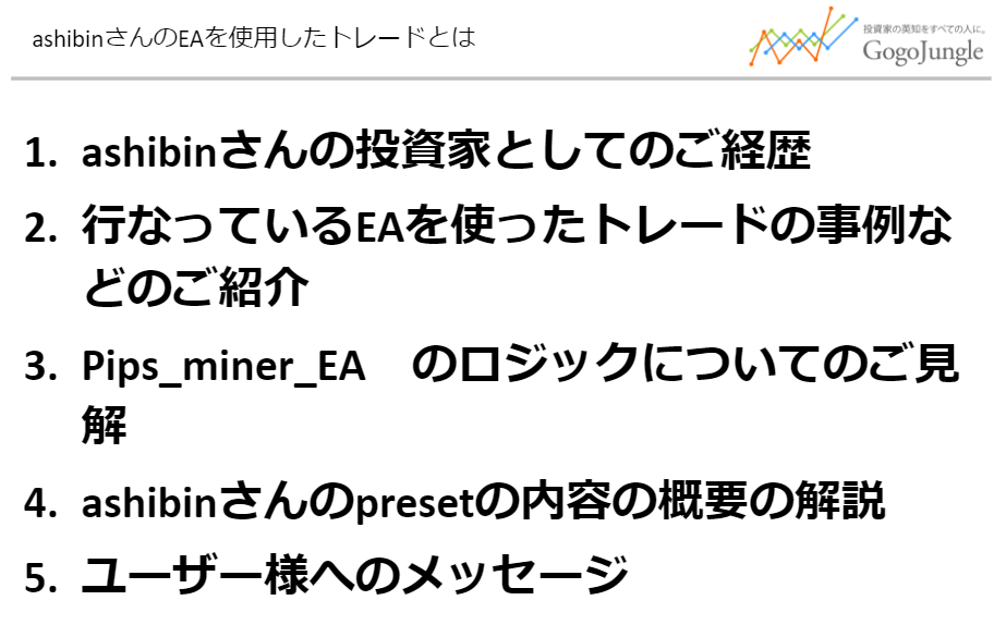 の記事で過去2回お届けいたしましたが、今回は、あらためてashibinさんのご経歴、Pips_Miner_EAのパラメーターの変更点や運用についてお話をお聞きしました。