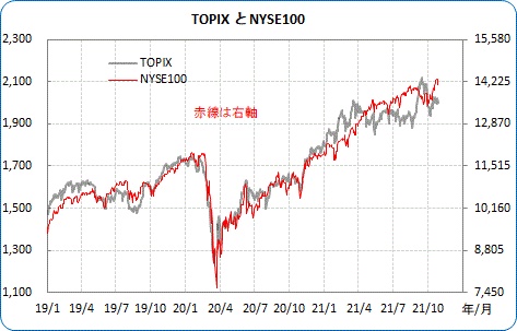 米国のFANGなどと比べても詮無いことなので、ニューヨーク証券取引所上場トップ100企業で構成されるNYSE100指数と比べてみると、まあまあ。