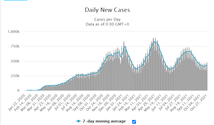 - コロナ新規感染者数の推移は少し上向いてきた(下に添付したチャート Daily New Cases は 7日間の移動平均で直近は上向いてきている)