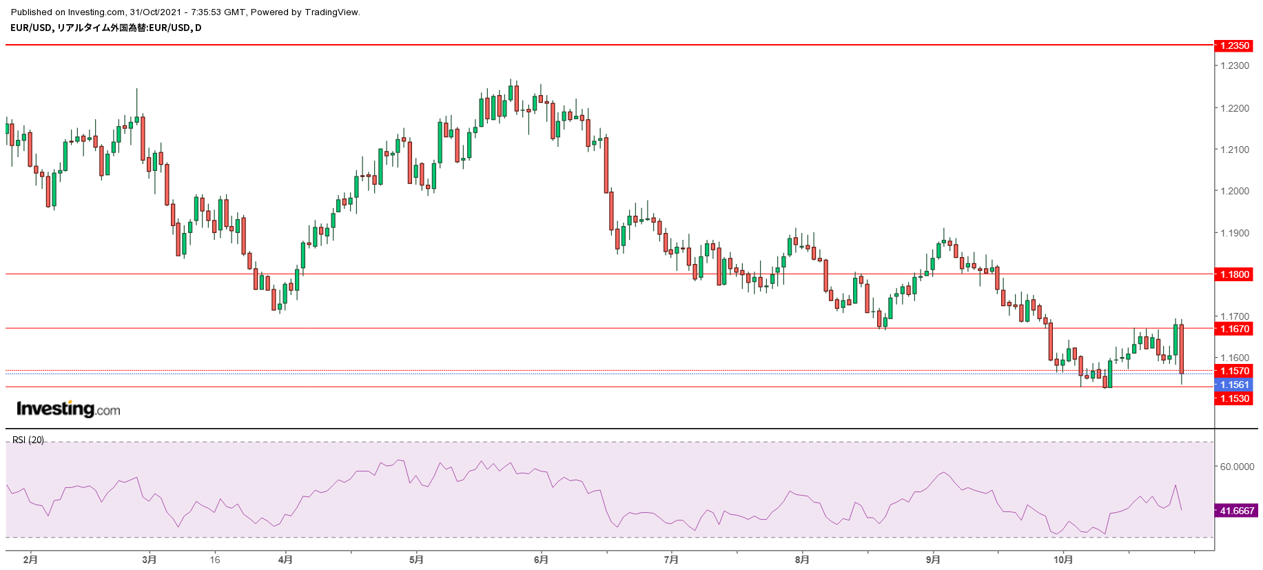 - ユーロ相場は、1ユーロ=1.1644ドルからスタート。週初はユーロ売りドル買いが優勢で1.1600レベルまで下落すると、その後は1.1600前後のオプション取引の影響で、その前後での取引がしばらく続いた。動き出したのは木曜日のECB理事会の記者会見で、記者からのインフレに関する質問に対してラガルド総裁が「私たちはインフレに関する打ち合わせばかりしている(Actually, we talked about inflation inflation, INFLATION)」と回答すると、早期の金融緩和縮小観測から、ドイツ債の利回りが上昇し、ユーロは1.1692まで買われた。しかし週末金曜日は月末でもあり、実需のドル買いが強まると一気に反転し、1.1600を下抜け、1.1535まで急落、1.1558でクローズと荒い値動きになった。