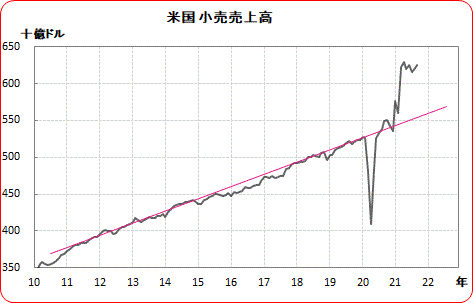 新型コロナ感染拡大後の経済対策で所得が拡大し、小売売上高が異常に伸びている。これがインフレの昂進の原因にもなっている。