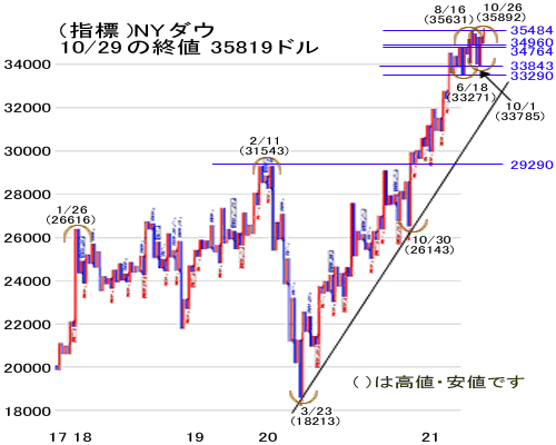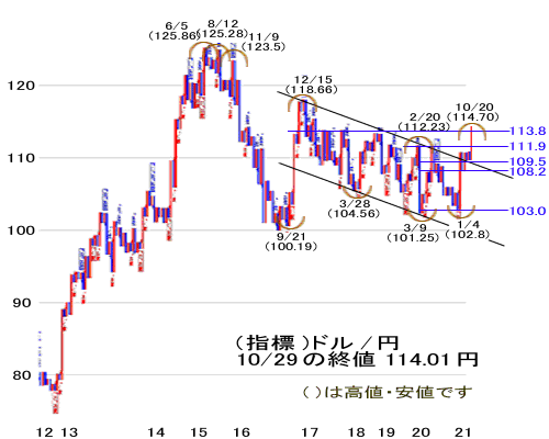 但し、11月の第1週間は3日(水)の祝日があり立会い日数は4日間であり、FOMCでは年内のテーパリング開始は確定路線となっており、今週、実行されなければ来月となります。今週、テーパリングが開始される場合は、タイミング的に米国株式は高値圏にあり、テーパリング開始をいったん材料出尽くして利益確定売りで下げる可能性もあり、その場合は日経平均も連動することになります。もう1つの見方は、11月2~3日に開かれるFOMCでテーパリングが開始されると焦点である利上げ時期の前倒しについてマーケットは一定程度織り込んでいると思われ、FRBの人事(FRB議長の指名や続投)をきっかけに上昇するパターンもあります。