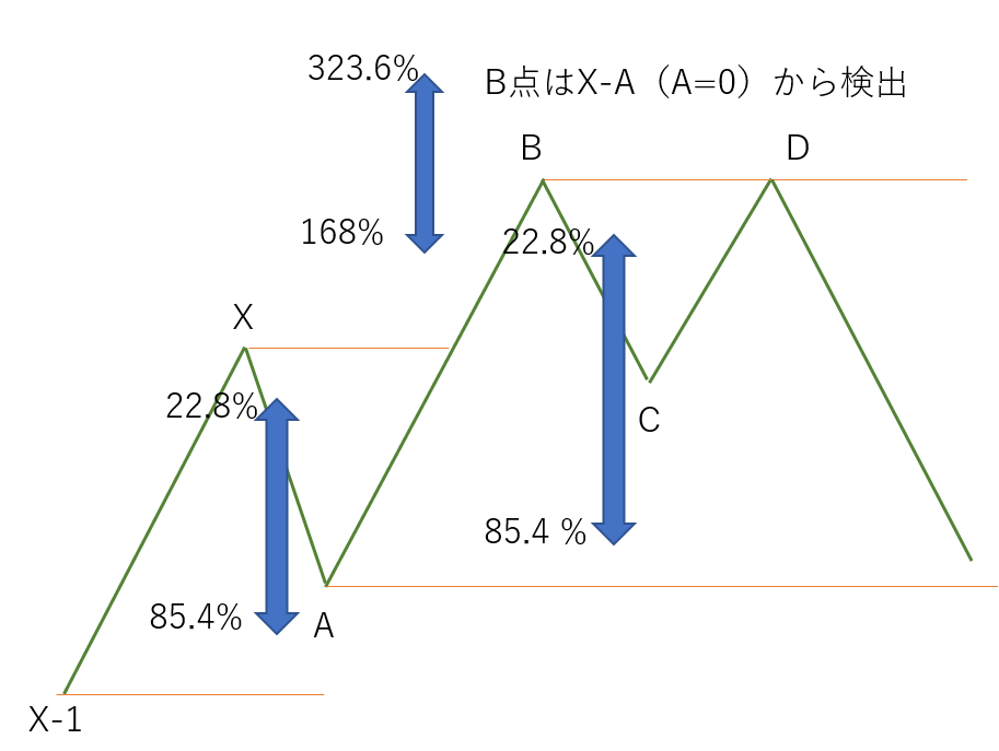 今回もダブルトップを考えるために一回絵にしました。ダブルトップ・ダブルボトムは上昇トレンドの際B点と一致するD点まで来たら検知するとします。いったん、前回のウォルフ波動よりはB点の位置を高めに設定しています。