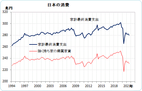 実際には支払っていないので、これを除いた消費を見ると、次のグラフの赤線。