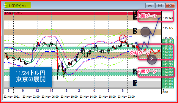 11/24東京は、週足ポイント115.00-05を完全ブレイクし”上限ゾーン”115.50=65まで続伸出来るかがキーポイントです。
