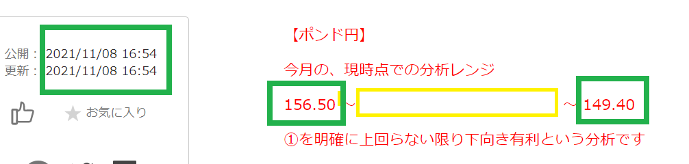 ポンド円11月1日の記事にて、【156.50を超えない限り下向き】という記事は
