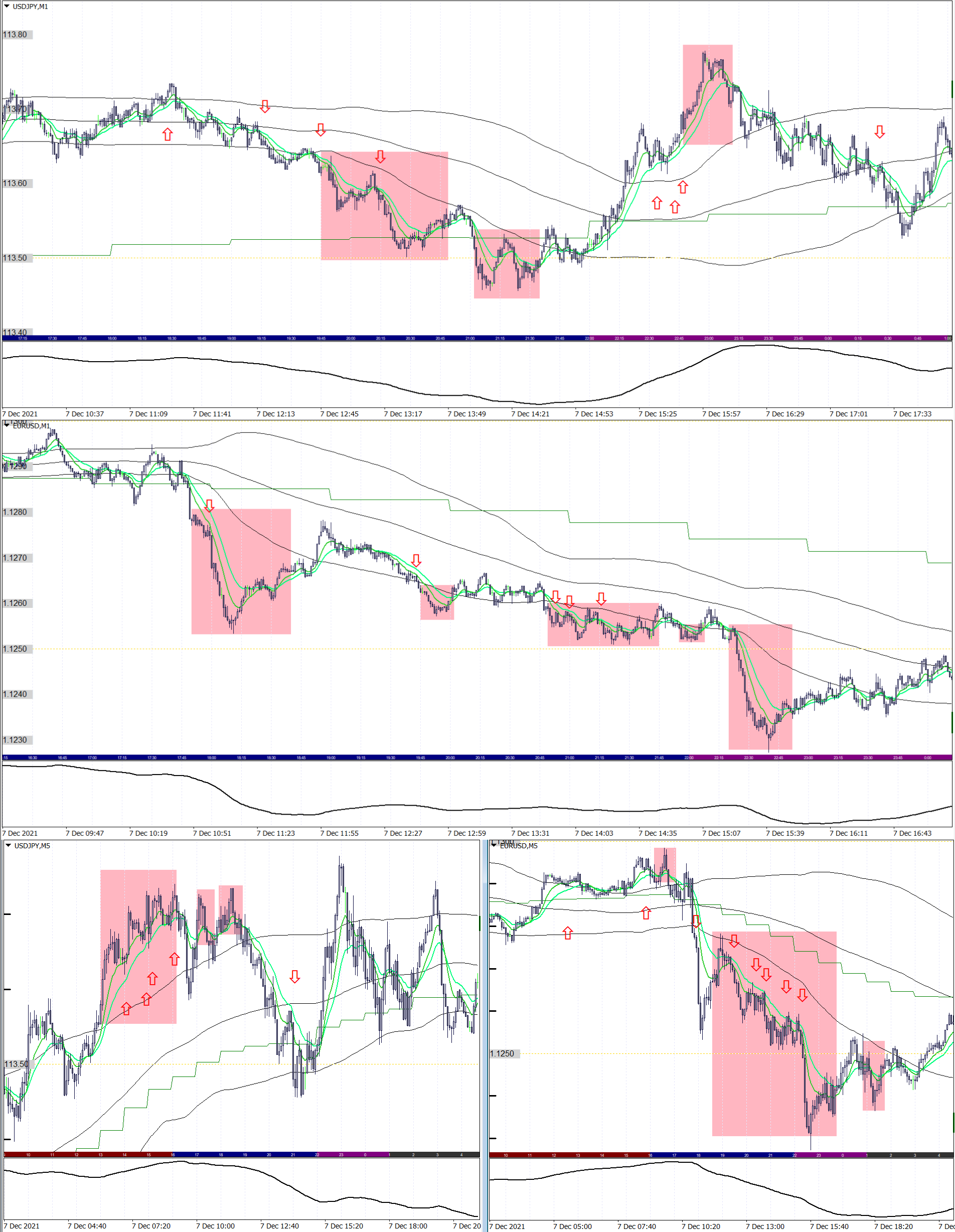 赤矢印:1日+3~10pipsのスキャルロジックによる、エントリーポイント