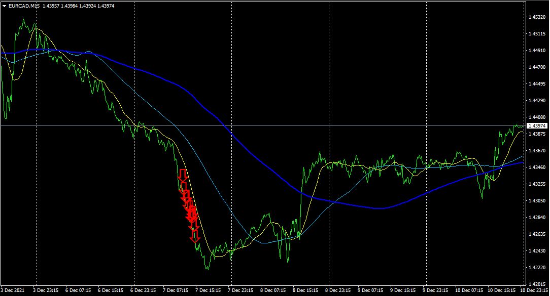 「28通貨ペア一覧インジケータ」が出したアラートの位置に赤色下向き矢印を表示しました。12月7日の売りアラートで売りポジションを建てていれば、100PIPS弱の利益になりました。