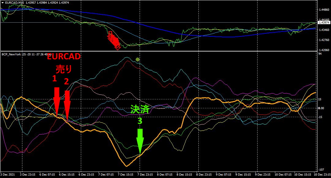上半分がEURCADの15分足チャートで、下半分が「8CP見える化インジケータ」です。オレンジ色太線のグラフがEURCADに相当します。